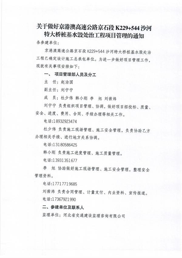 關(guān)于做好京港澳高速公路京石段K229+544沙河特大橋樁基水毀處治工程項目管理的通知
