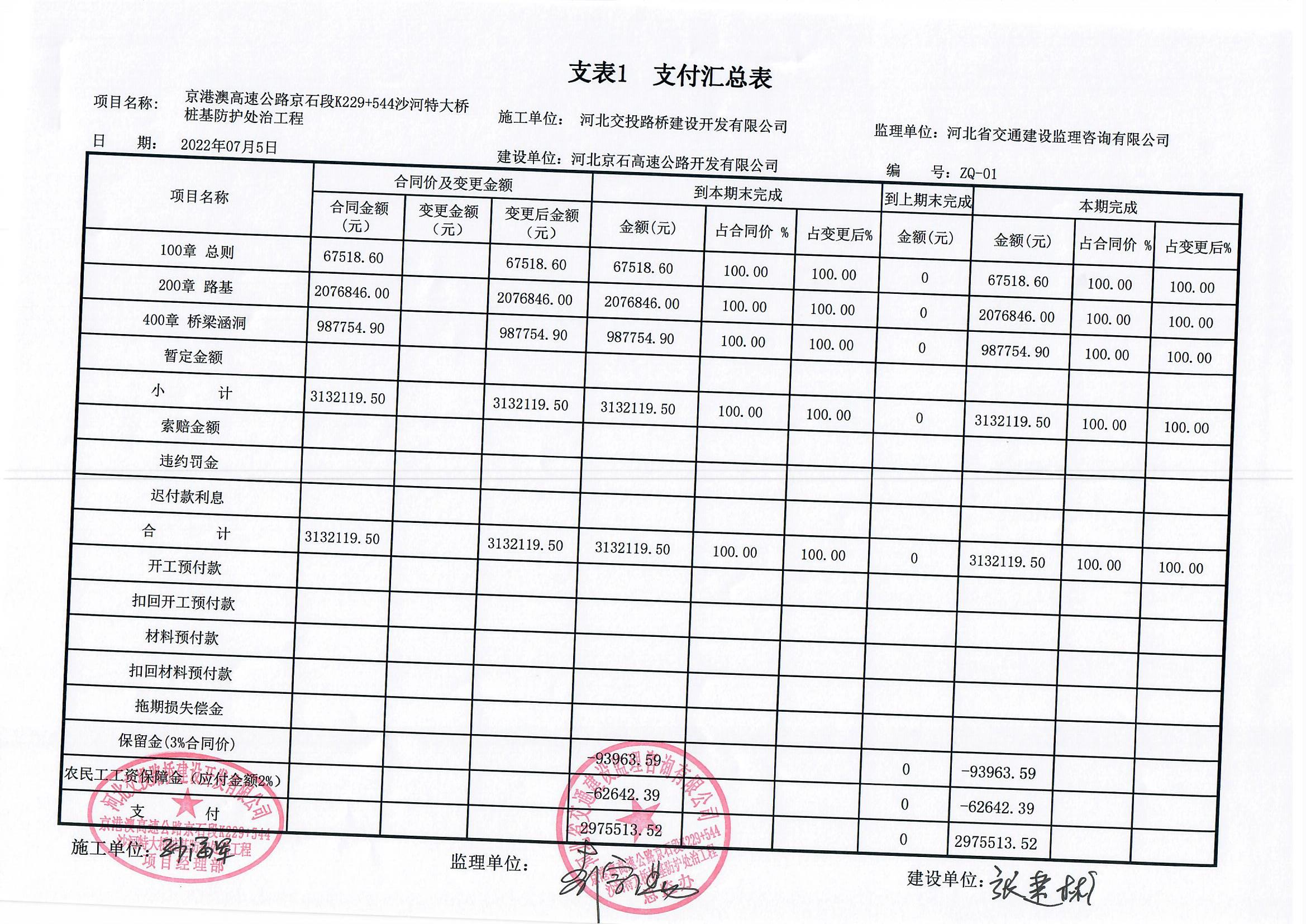 京港澳高速京石段沙河特大橋樁基防護(hù)處治工程支付證書應(yīng)