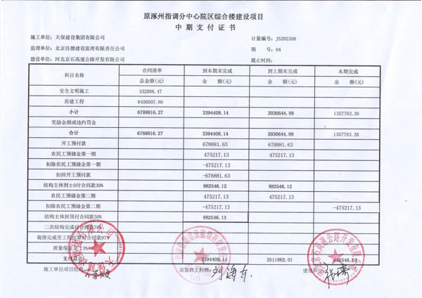 原涿州指調(diào)分中心院區(qū)綜合樓建設(shè)項目第四期中期支付證書