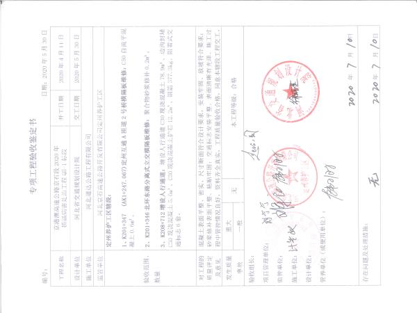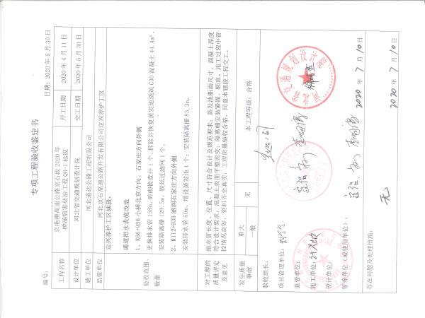 京港澳高速公路京石段2020年橋涵病害處治工程QH-1標(biāo)段驗(yàn)收證書