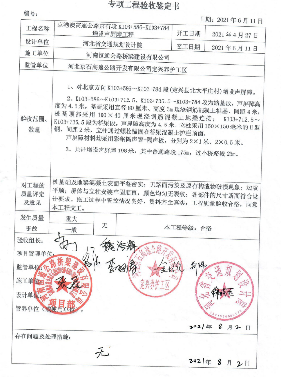 京港澳高速公路京石段K103+586-K103+784段增設聲屏障工程驗收鑒定書