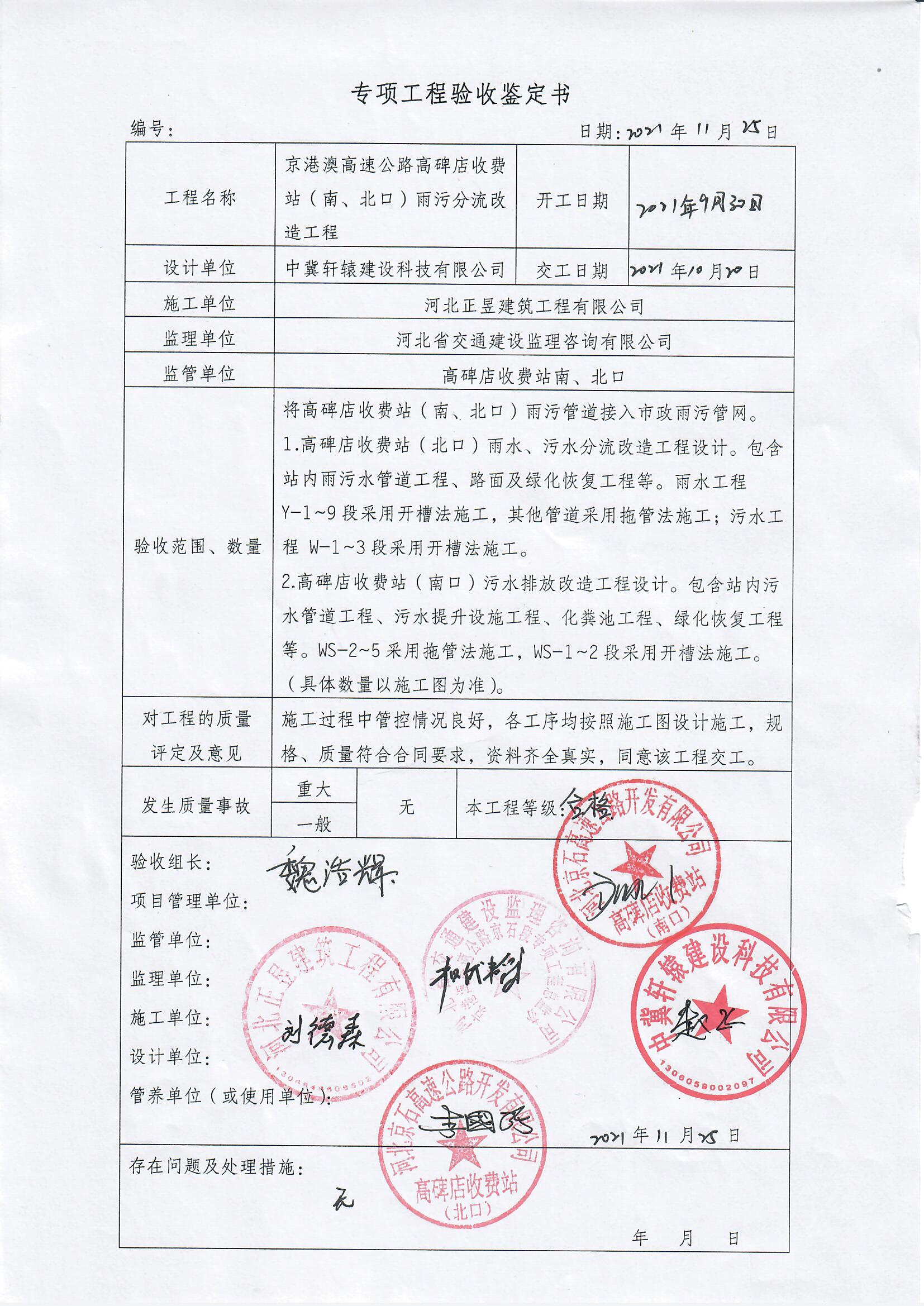 京港澳高速公路高碑店收費站(南、北口)雨污分流改造工程驗收單