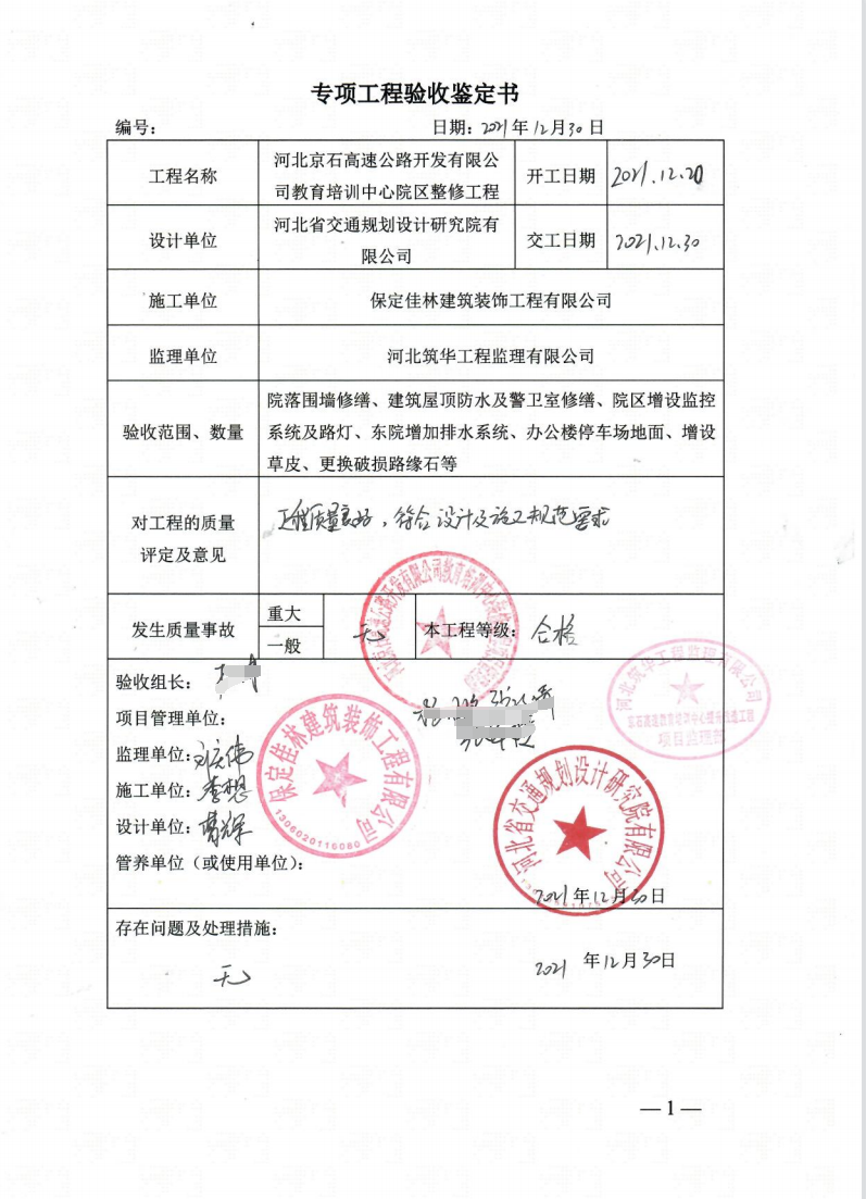 河北京石高速公路開發(fā)有限公司教育培訓(xùn)中心院區(qū)整修工程竣工驗收