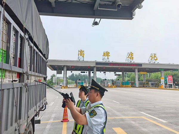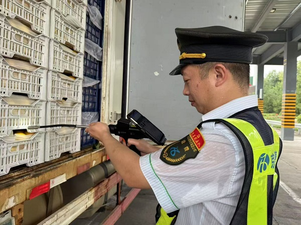 正午時(shí)分,收費(fèi)站廣場(chǎng)地表溫度直逼60℃,瀝青路面泛起微光。黨員們身著反光背心,手持查驗(yàn)終端,穿梭于一輛輛綠通貨車之間。掀開篷布時(shí),撲面而來的熱浪裹挾著果蔬氣息,他們卻無暇擦拭額頭豆大的汗珠,仔細(xì)核對(duì)貨物品類、查驗(yàn)裝載空間、拍攝留存影像?!跋募竟瞎赘瘔模轵?yàn)速度就是效率,更是民生溫度。”