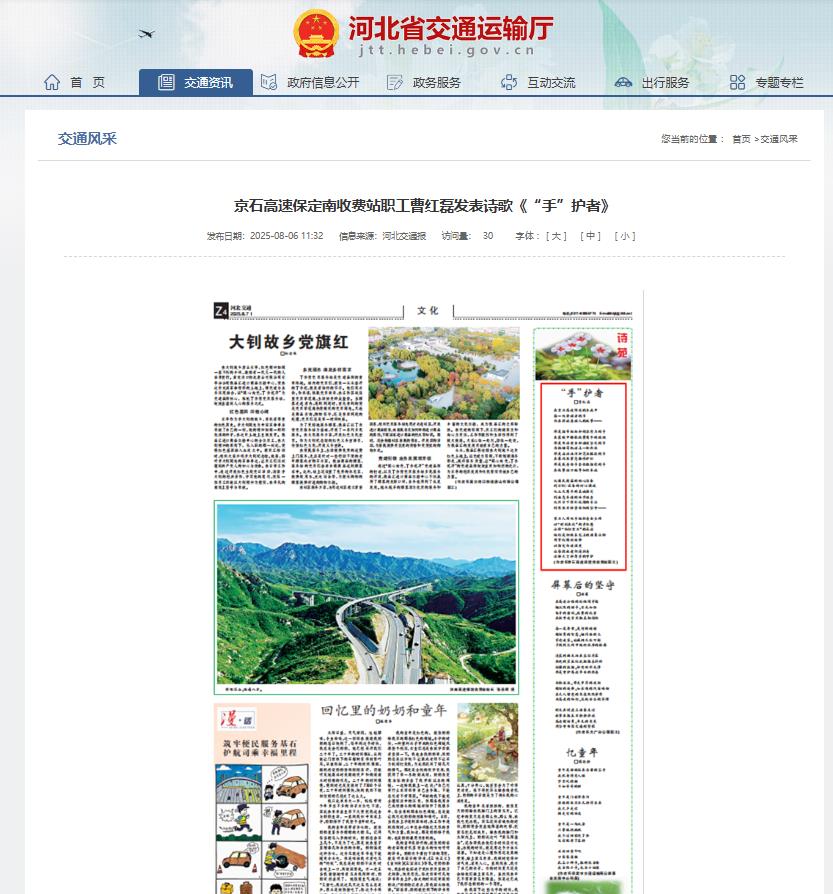 【河北交通運輸廳高速動態(tài)】京石高速保定南收費站職工曹紅磊發(fā)表詩歌《“手”護者》