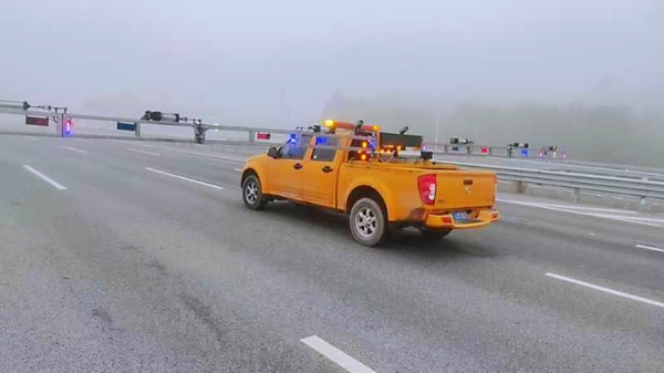 京石高速智調中心發(fā)布了大霧黃色風險預警,并下達了壓車帶道的準備工作指令。定興養(yǎng)護工區(qū)接到指令后,立即在工作微信群中發(fā)布了預警信息,并做好了人員、車輛、設施設備的準備工作。經(jīng)過路警會商,從健康城開始執(zhí)行壓車帶道任務。定興工區(qū)的帶道車展開“雙翼”居中,與路警車輛組成壓車隊,“一”字形橫向排布在各條車道上,以40公里/時的速度帶領車隊安全通過霧區(qū),直至清苑收費站,行駛里程近110公里,壓車帶道任務順利完成。全程通過車載揚聲器進行安全警示,提醒社會車輛注意行車安全。壓車帶道舉措顯著提升了司乘人員的通行體驗,有效減輕了道路安全壓力,為公眾出行創(chuàng)造了更加順暢、安全的交通環(huán)境。