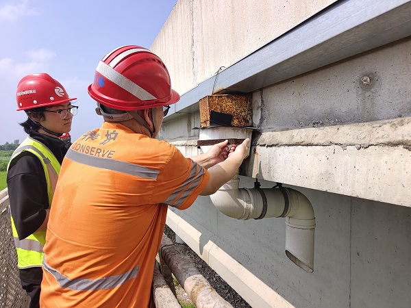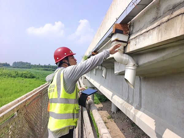 此次檢測嚴格依照《公路橋梁技術(shù)狀況評定標準》,實現(xiàn)橋梁“全結(jié)構(gòu)、無死角”排查。從橋面到橋底,從主體結(jié)構(gòu)到附屬設(shè)施,每一處細節(jié)均納入精細化檢查范圍:橋面系重點關(guān)注鋪裝平整度、伸縮縫狀況及排水系統(tǒng)通暢性,上部結(jié)構(gòu)聚焦承重構(gòu)件混凝土裂縫與支座狀態(tài),下部結(jié)構(gòu)則細致核查橋墩橋臺穩(wěn)定性及護坡完整性。技術(shù)人員根據(jù)不同橋梁的結(jié)構(gòu)特性,靈活借助橋檢車延伸作業(yè)平臺、登高梯攀爬等方式,深入探查是上部結(jié)構(gòu)、蓋梁頂部等隱蔽部位的潛在病害。對各項數(shù)據(jù)反復測量、仔細核對、詳細記錄,確保病害“早發(fā)現(xiàn)、早識別、不遺漏”,為精準評定橋梁技術(shù)狀況筑牢數(shù)據(jù)基礎(chǔ)。