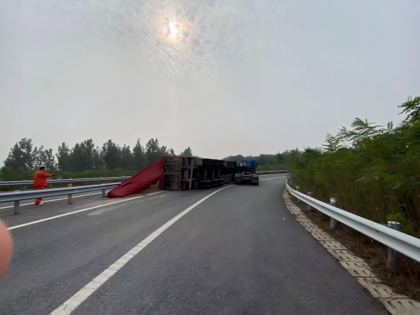 險(xiǎn)情突發(fā)之際,機(jī)電二科值班人員迅速啟動(dòng)應(yīng)急處置流程。一方面立即指揮后方來車靠邊??浚硪环矫鎸?duì)貨車司機(jī)展開情況核查。在確認(rèn)司機(jī)身體無大礙后,二人即刻啟動(dòng)多方聯(lián)動(dòng)機(jī)制——同步聯(lián)系智慧調(diào)度監(jiān)控中心、高速交警、養(yǎng)護(hù)工區(qū)及路政大隊(duì),精準(zhǔn)上報(bào)事故具體位置、現(xiàn)場(chǎng)擁堵程度及貨物散落范圍等關(guān)鍵信息;與此同時(shí),及時(shí)通知機(jī)場(chǎng)東收費(fèi)站安排人員趕赴現(xiàn)場(chǎng),疏導(dǎo)后方積壓車輛。為防范二次事故,二人還在事故現(xiàn)場(chǎng)后方快速布設(shè)反光錐桶,劃定安全警示區(qū)域,全程堅(jiān)守現(xiàn)場(chǎng)維護(hù)交通秩序。