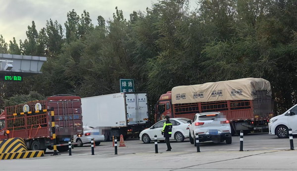 下午3時30分左右,第一波繞行車流抵達(dá)站口。望都站廣場瞬間排起長隊,卻秩序井然——疏導(dǎo)人員在車道間來回穿梭,精準(zhǔn)引導(dǎo)小型客車、大型貨車分道通行;收費(fèi)員協(xié)助司機(jī)取卡、收費(fèi)等;綠通查驗(yàn)崗的人員認(rèn)真拍照留檔,額角的汗珠閃著光:“綠通車輛必須嚴(yán)查細(xì)驗(yàn),既保暢通,更不能漏放違規(guī)車!”