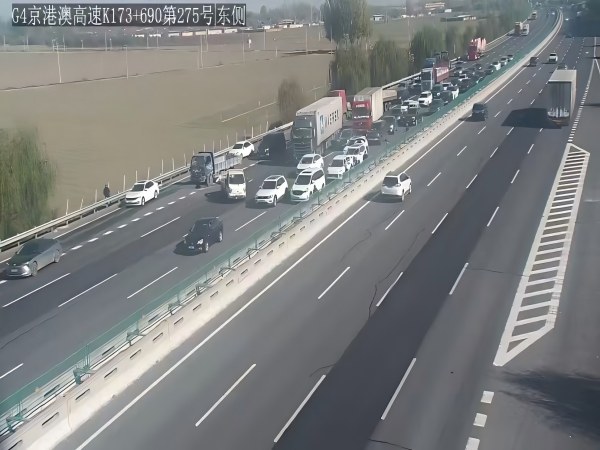 11月15日11時25分,智慧調度中心監(jiān)控人員通過視頻巡檢發(fā)現(xiàn),京石高速南行K173處發(fā)生兩輛貨車追尾事故,占據(jù)兩條車道,導致后方車流積壓,現(xiàn)場通行緩慢且風險加劇。