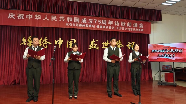 錦繡中國(guó),盛世華誕,七十五載,征程如虹。為隆重慶祝中華人民共和國(guó)成立七十五周年,延續(xù)京冀兩地高速收費(fèi)站共建深情,共同抒發(fā)熱烈的愛(ài)國(guó)情懷,9月30日上午,健康城收費(fèi)站、涿州收費(fèi)站黨支部聯(lián)合兩站分會(huì)與京開(kāi)分公司竇店收費(fèi)所,在健康城站共同開(kāi)展了慶祝中華人民共和國(guó)成立75周年詩(shī)歌朗誦會(huì)活動(dòng)。奮斗在祖國(guó)交通事業(yè)一線(xiàn)的工作者們,滿(mǎn)懷豪情,把對(duì)祖國(guó)的無(wú)盡熱愛(ài)熔鑄于一首首激情澎湃的詩(shī)篇之中,以詩(shī)的激昂韻律,歌頌祖國(guó)的壯麗騰飛。